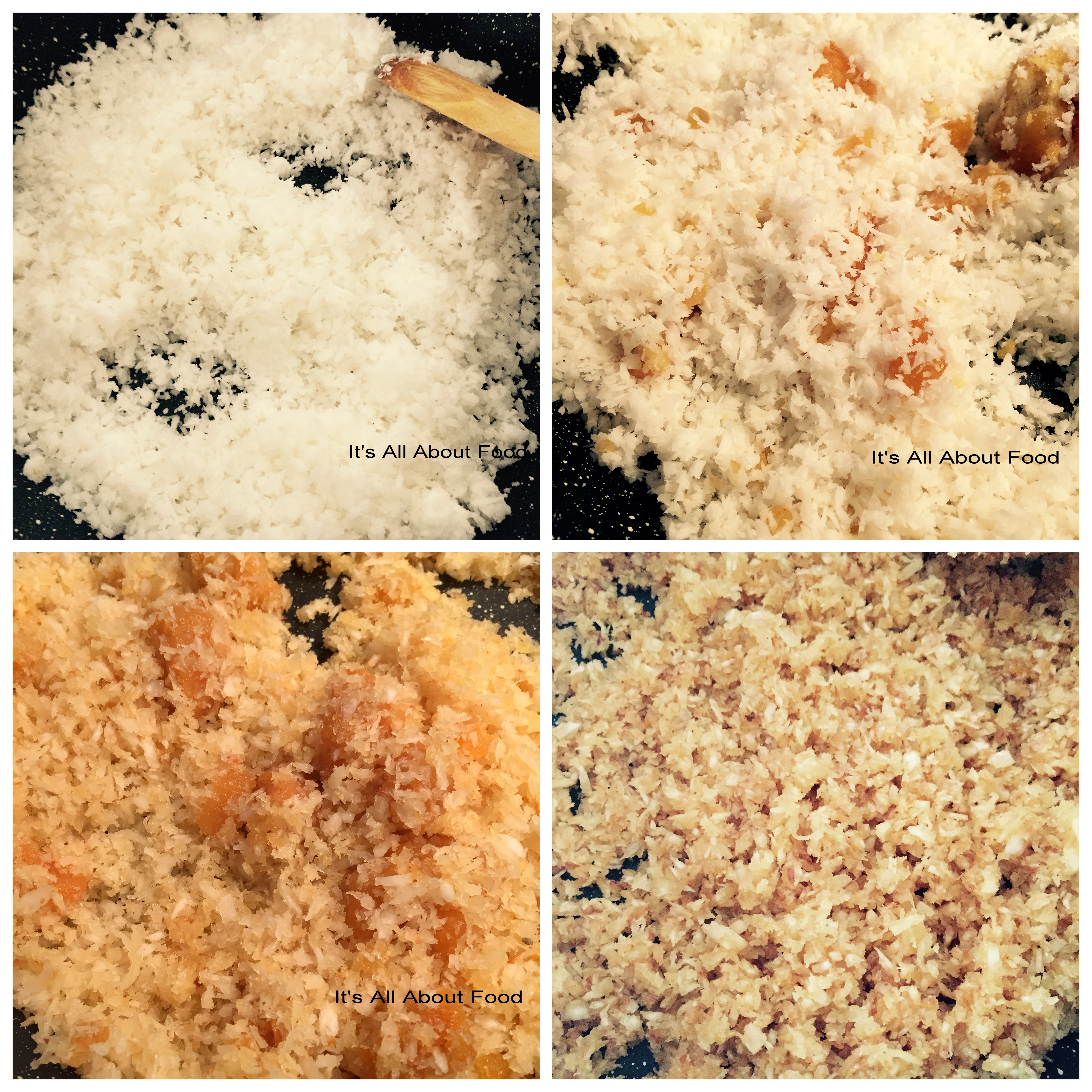 • In a pan mix coconut and jaggery and keep them on medium flame. Keep mixing and make sure they do not burn.