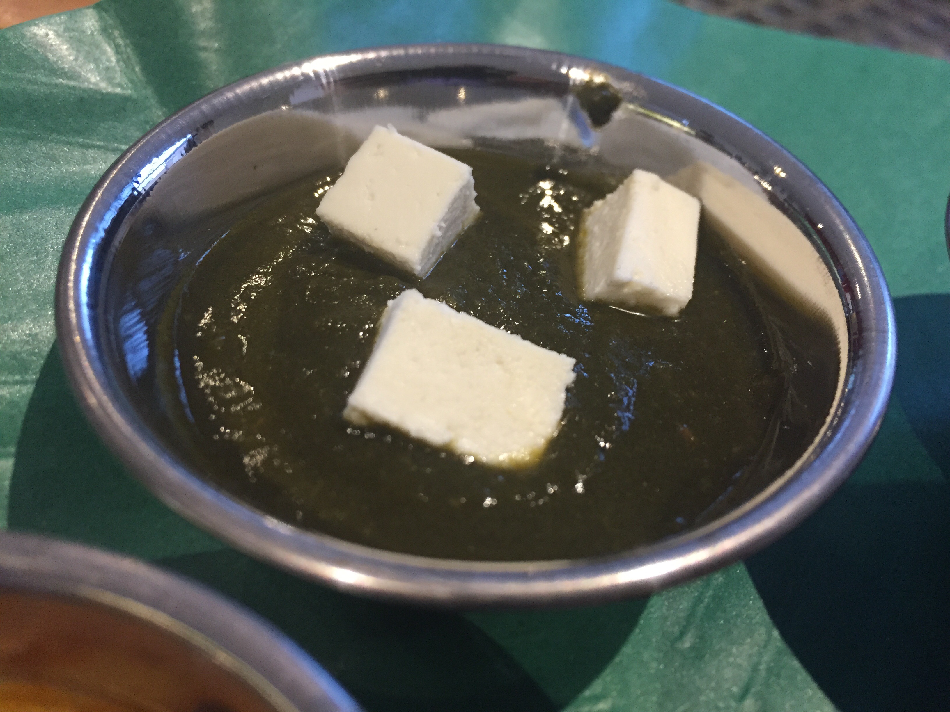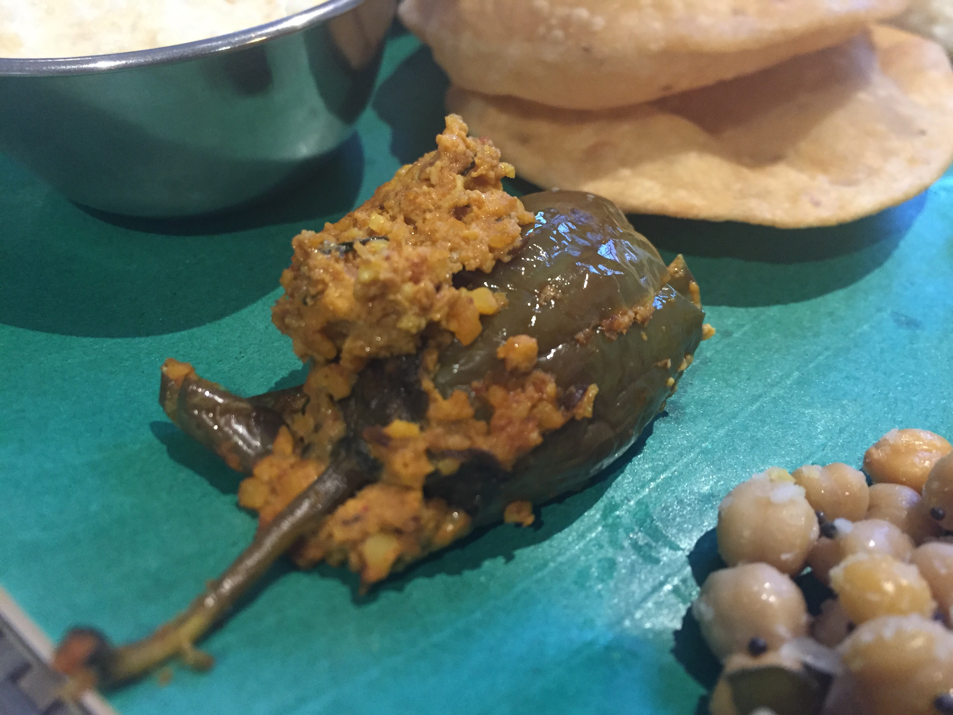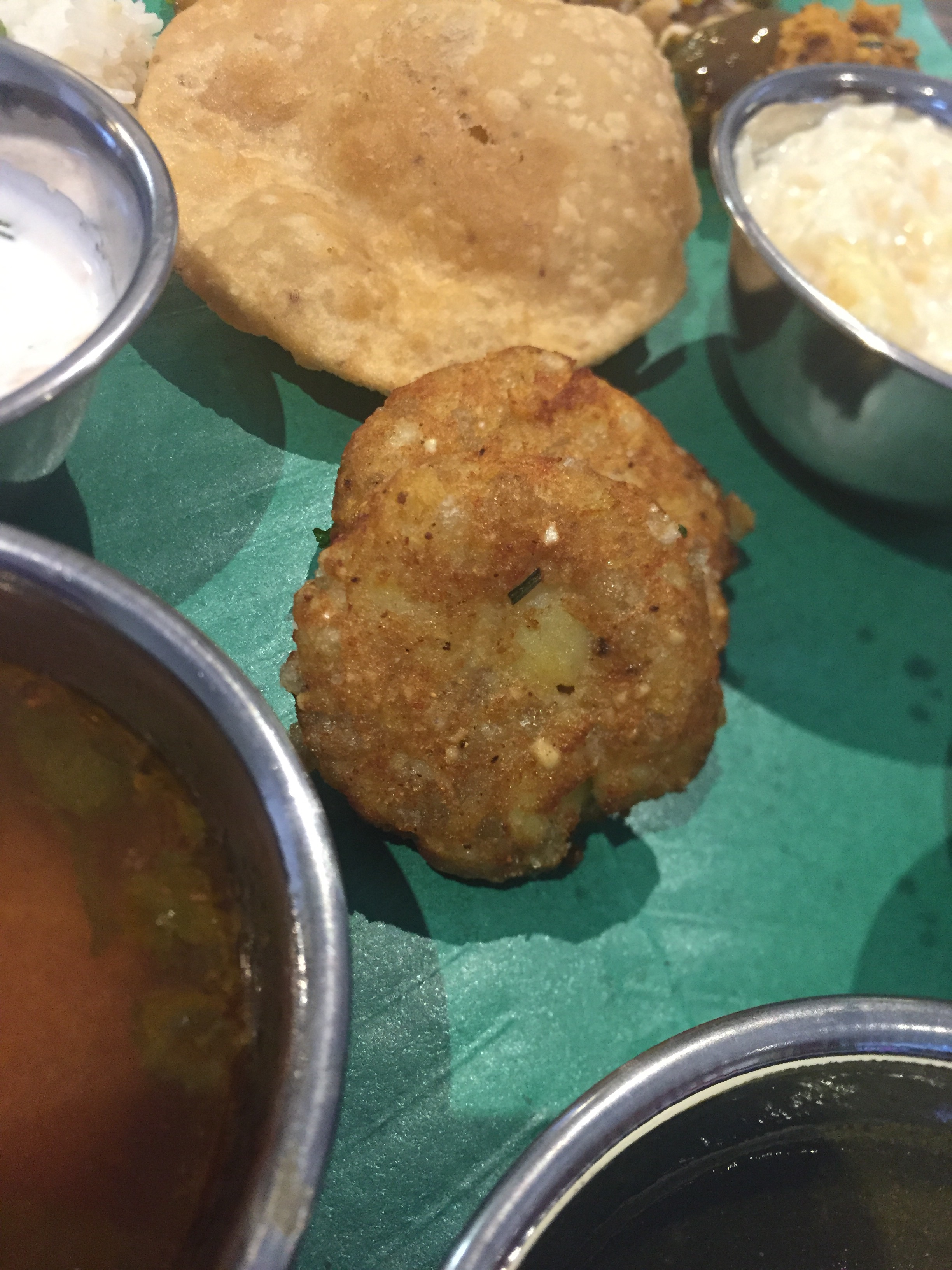 Clockwise – Peas and Jeera Rice, Methi Aloo, Chickpea Sundal, Stuffed Eggplant, Rice Kheer, Dal Fry, Palak Paneer, Tomato Rasam, Raita.. In the centre – Puri and Sabudana Vada..