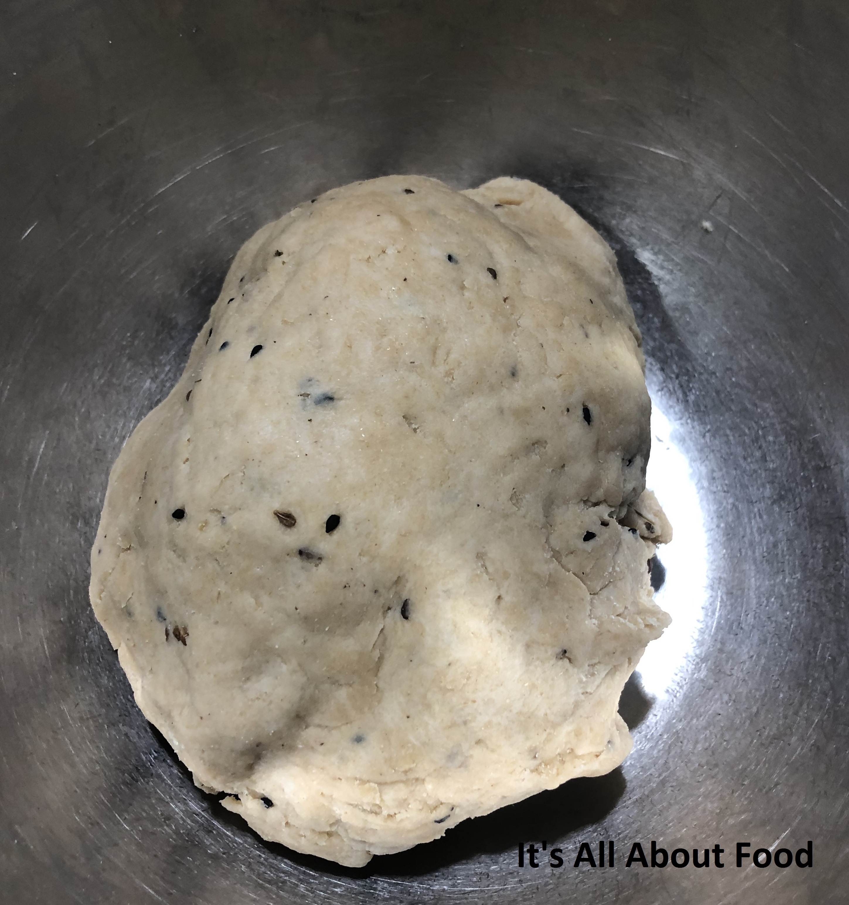 Like for most baking recipes, proofing of yeast is similarly essential for mathri, steps to knead the dough are crucial. Let’s get started; First add salt, ajwain, black pepper and Kalonji in the atta and mix all these dry ingredients together, now add oil to the dough and mix the dough well till all the oil is mixed in and a crumbling texture is achieved as shown in the picture below (this is an important step). When you hold the dough between your palms it should hold the shape and then crumble. Now, with this dough you can get creative and add ingredients of your choice, my other post for making mathri – recipe link here, has more ideas for flavours.