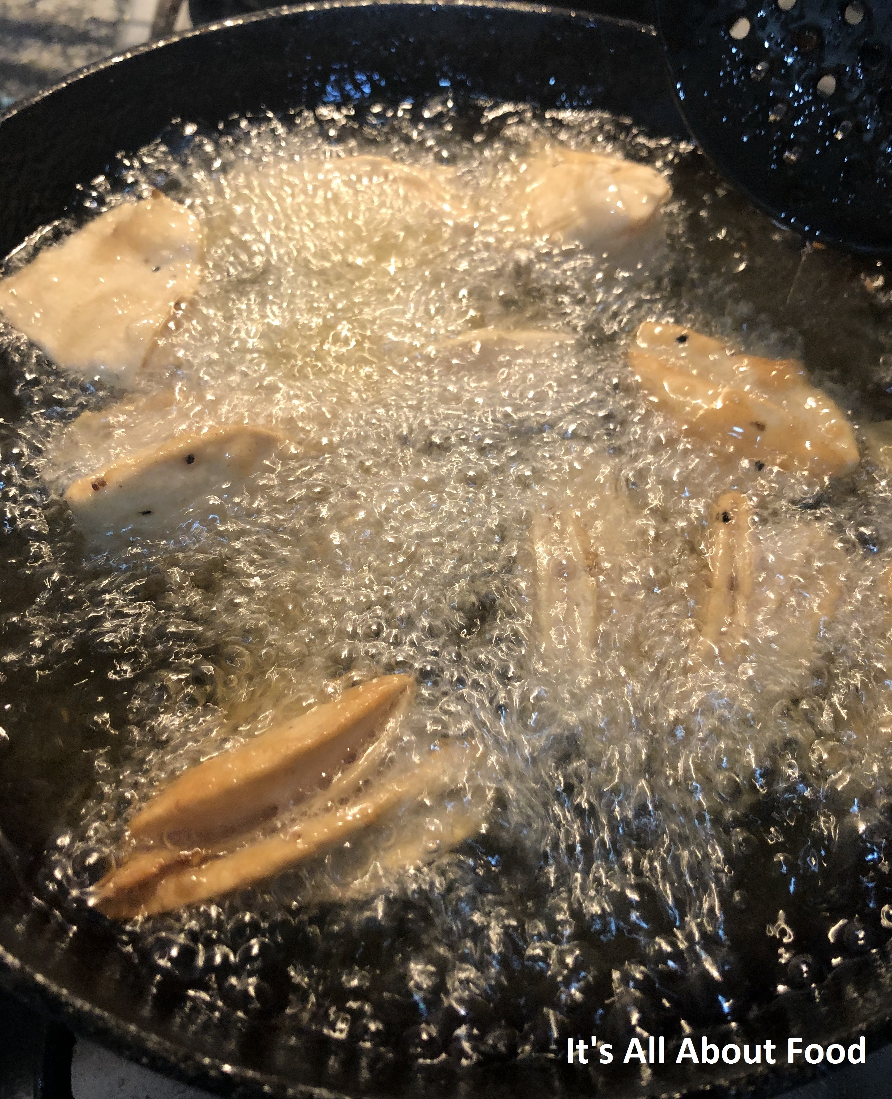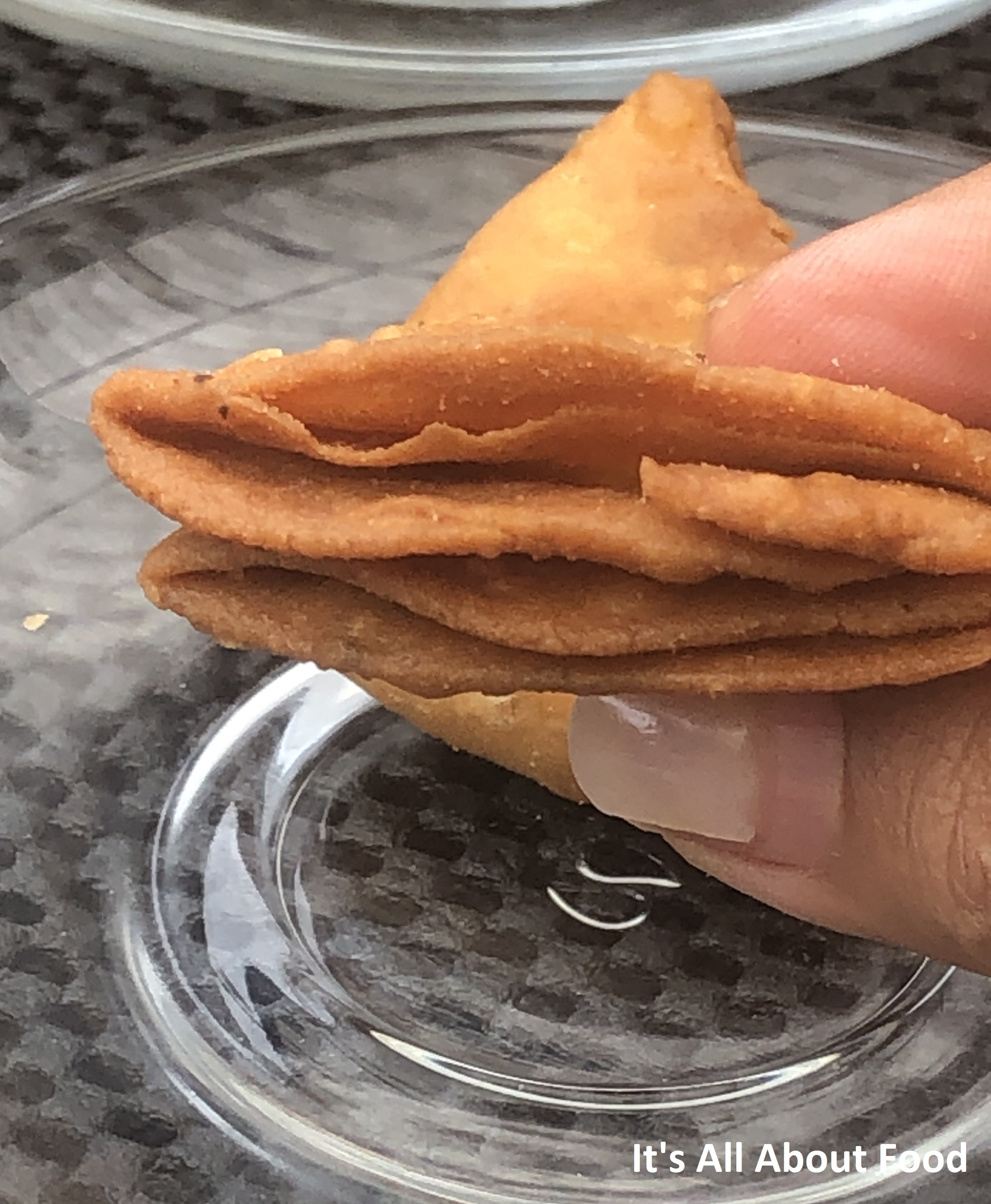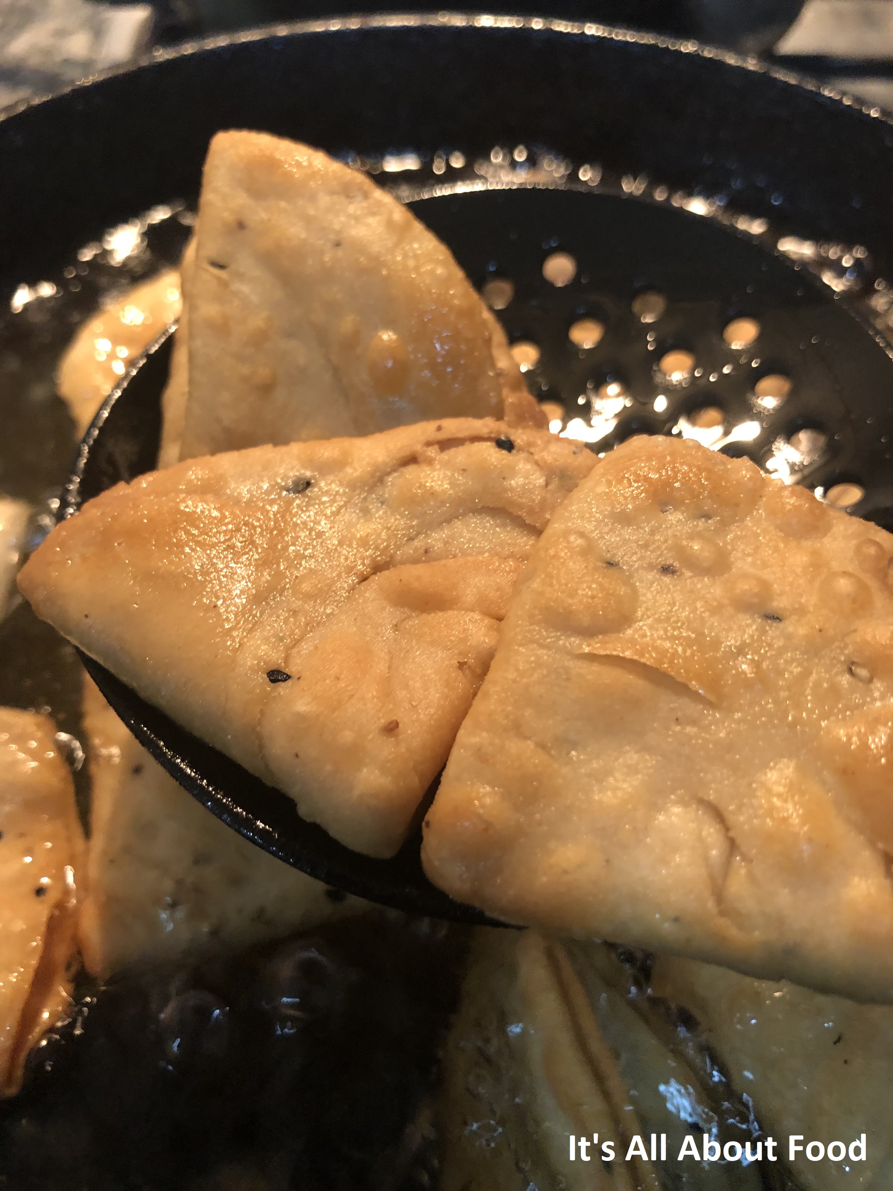 - Using your palm flatten the pieces to make them like a disc(picture reference above) and then using a rolling pin roll them in small circle. Then fold them in half and fold in quarter again. Once all the triangles are ready we can fry them in batches in hot oil.