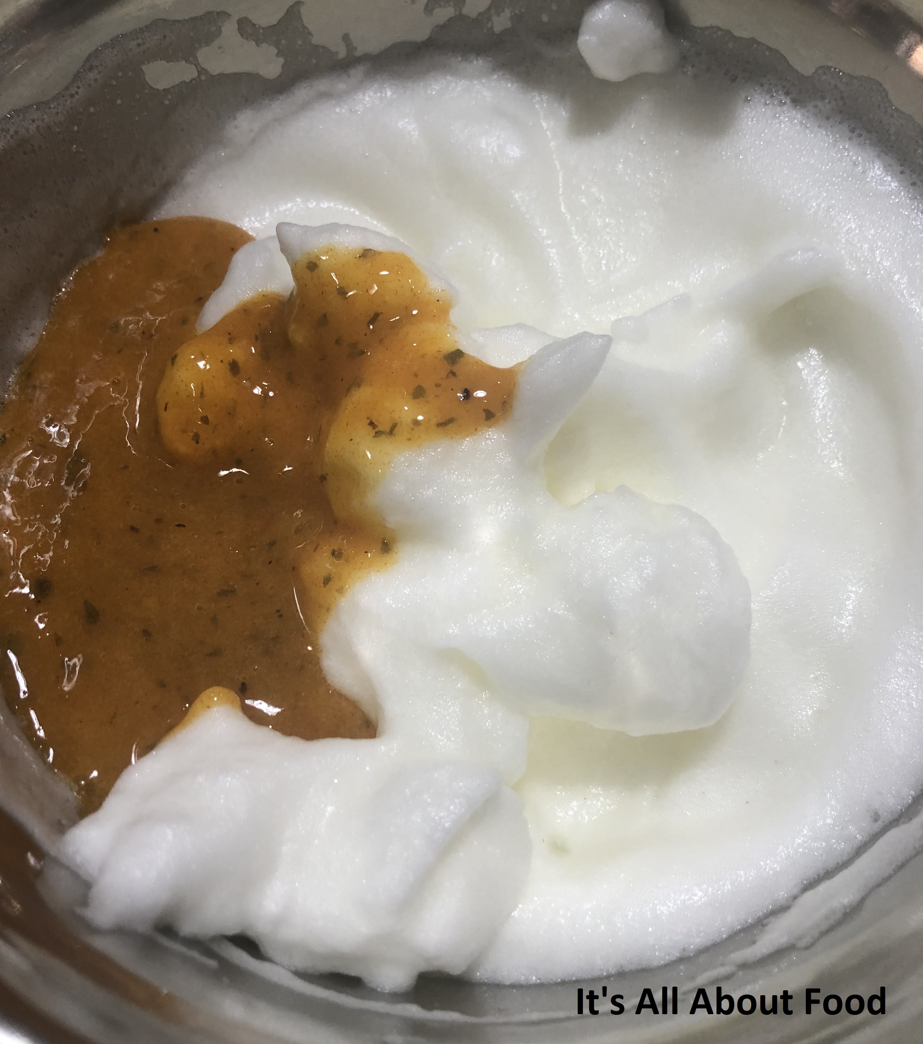 On the other hand, beat the egg whites till stiff peaks are formed. Use an electrical beater and churn till its all stiff and even when the bowl is turned upside down the eggs won’t fall.