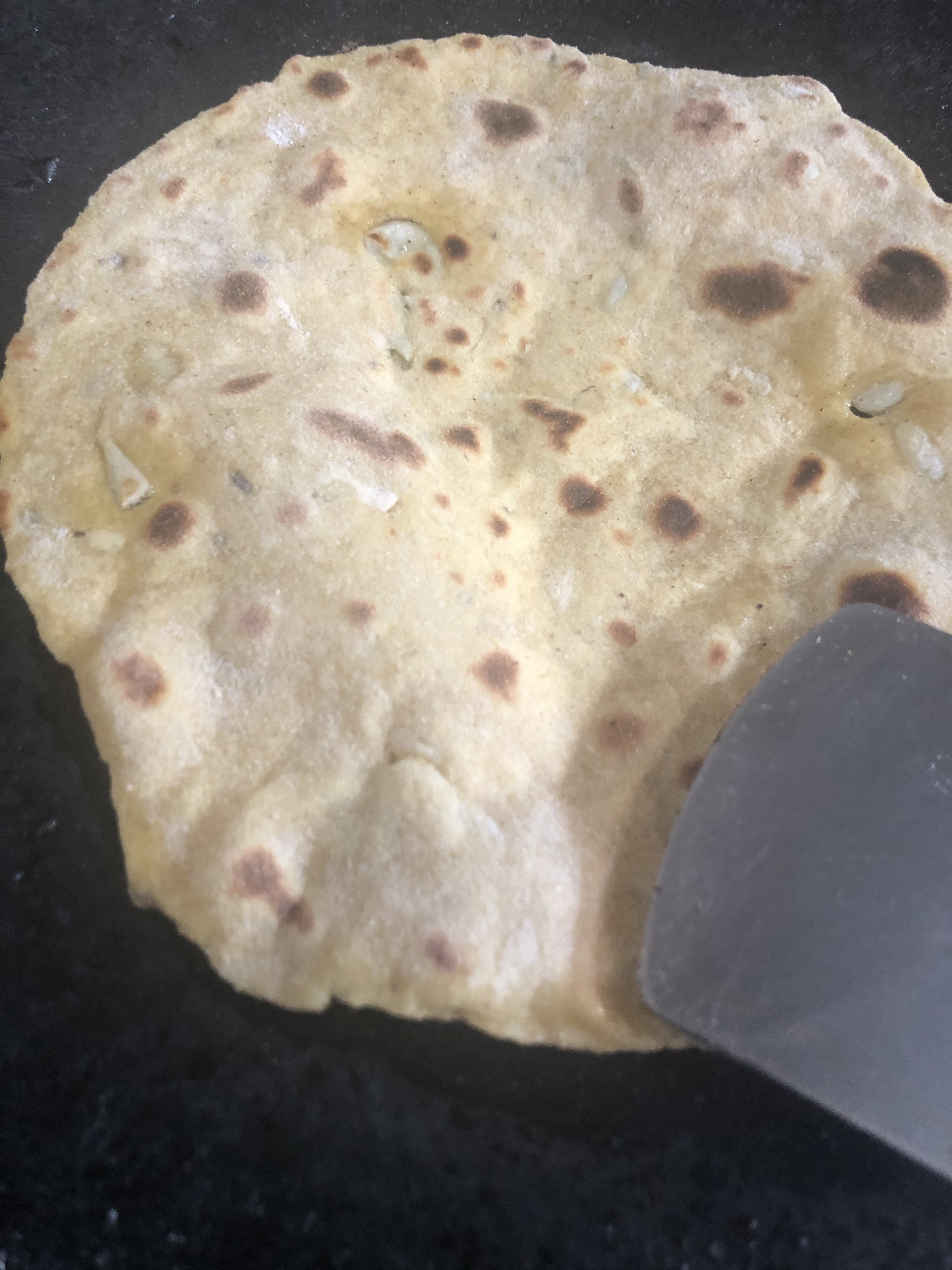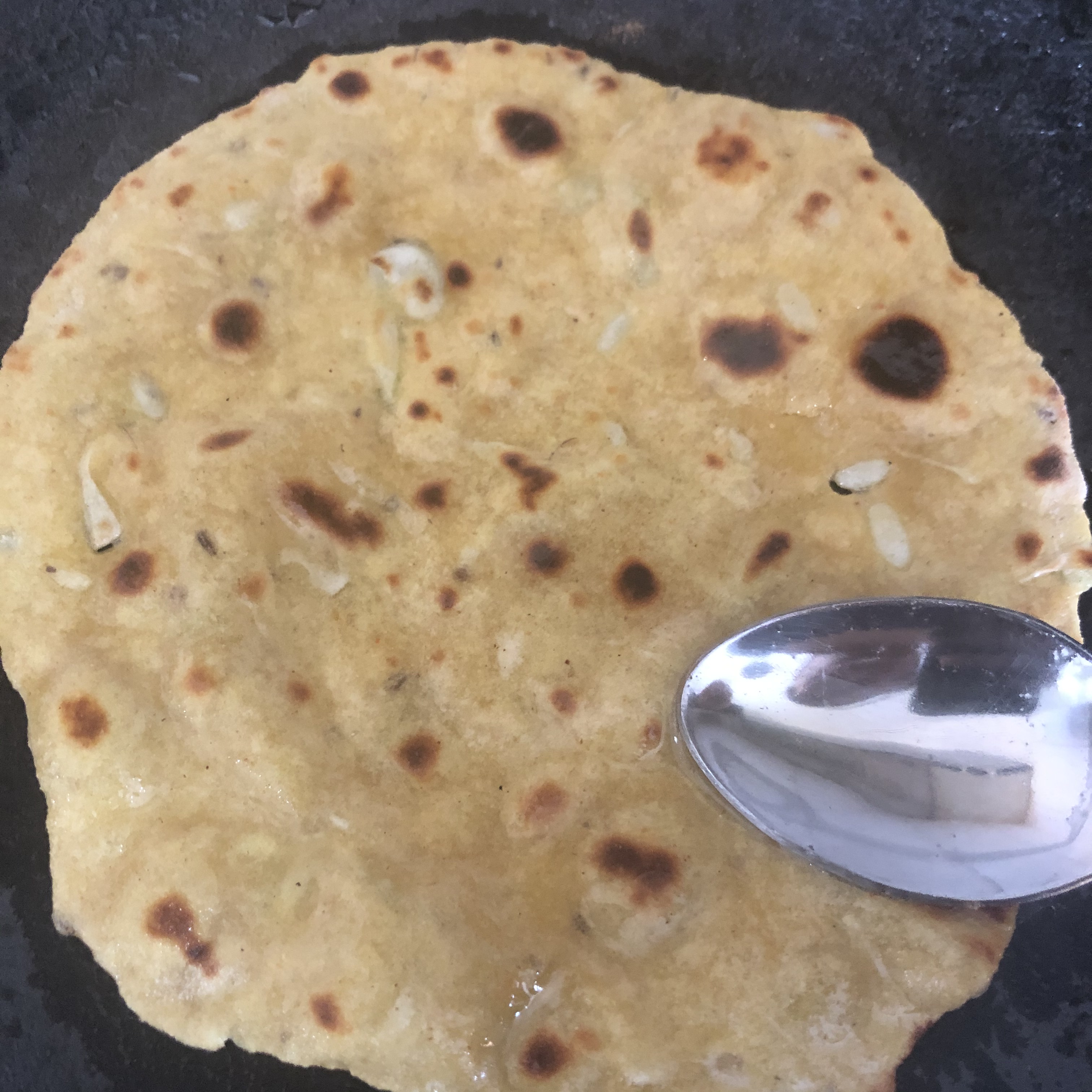 - Flip the thepla over after 30 seconds and apply oil on the side cooked and drizzling some oil on the corner of the thepla.
